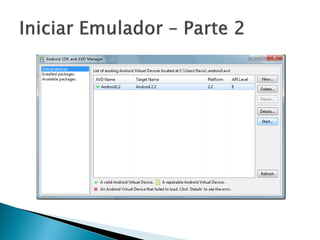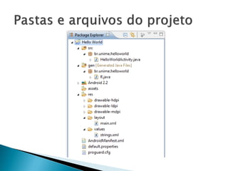 Este documento fornece uma introdução ao desenvolvimento de aplicativos para dispositivos móveis com Android, cobrindo tópicos como o ambiente de desenvolvimento Android, criando um "Hello World", conceitos básicos do Android e onde encontrar mais informações.