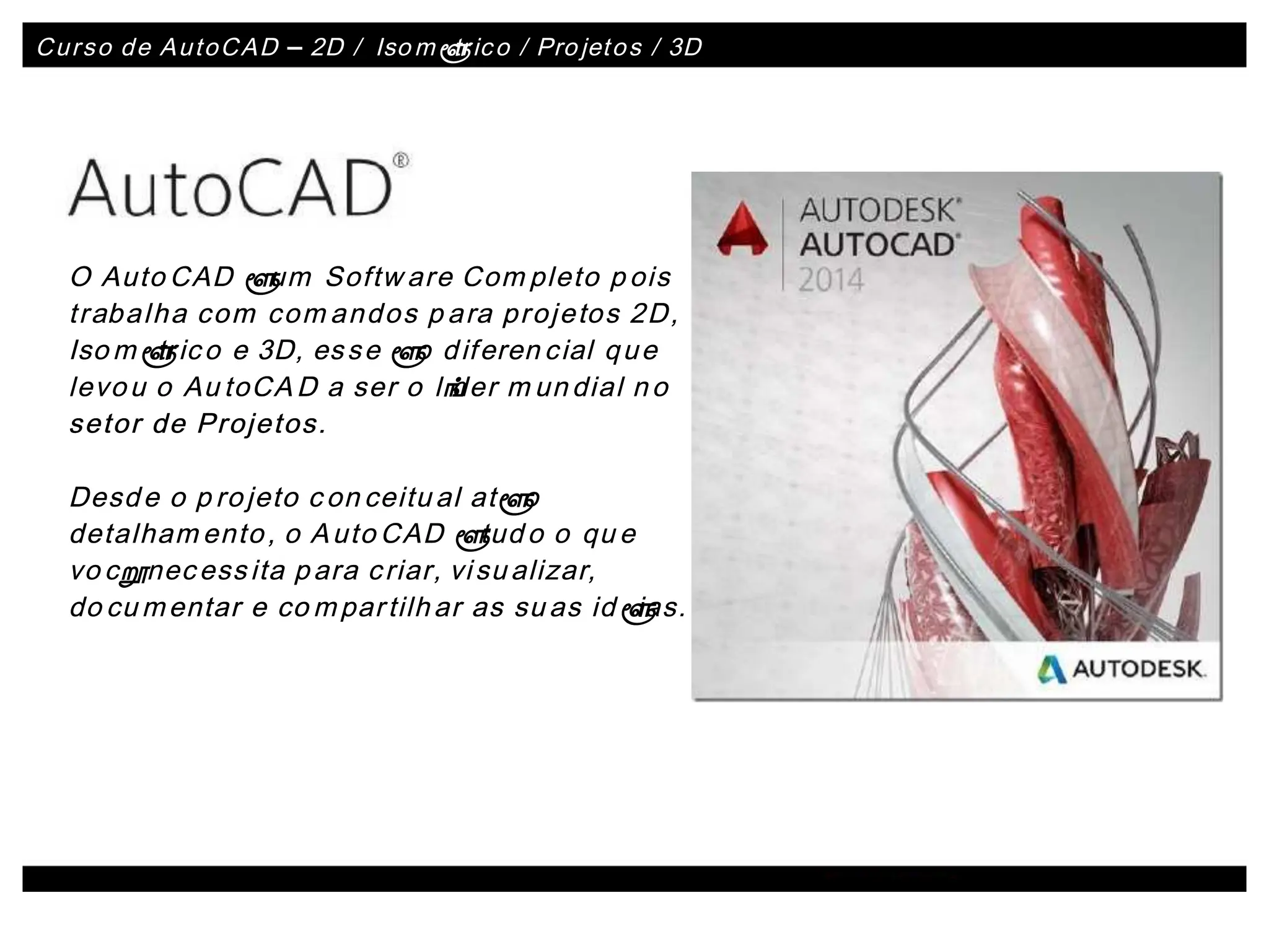 O curso de AutoCAD abrange a criação e visualização de projetos em 2D e 3D, incluindo diversas áreas como arquitetura, engenharia e design. O treinamento oferece atendimento personalizado, flexibilidade de horários e acesso a materiais de suporte, além de certificação reconhecida. O curso é ministrado por professores experientes e proporciona ao aluno a comodidade de estudar no próprio ambiente.