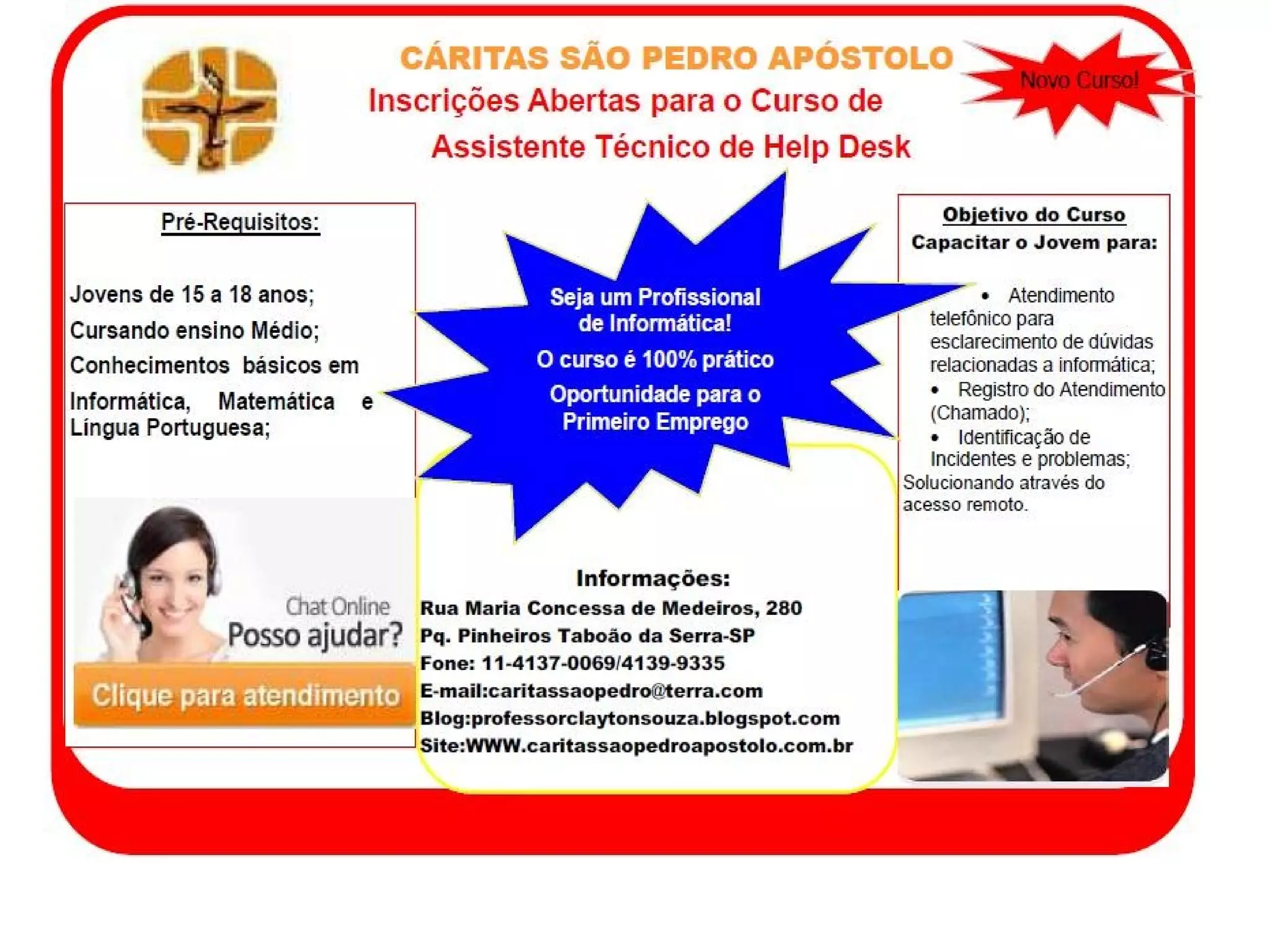 Objetivo do Curso é capacitar Jovens para o mercado de trabalho na area de Tecnologia da Informação. Atendimento telefônico, solucionando problemas e incidentes de informática com ferramentas de acesso remoto, mais informações no blog: professorclaytonsouza.blogspot.com