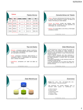 O documento apresenta conceitos sobre bancos de dados, incluindo sua definição, sistemas gerenciadores de bancos de dados, modelos de bancos de dados, tabelas, colunas, registros, tipos de dados e data warehouse. Exemplos de exercícios sobre bancos de dados são fornecidos no final.