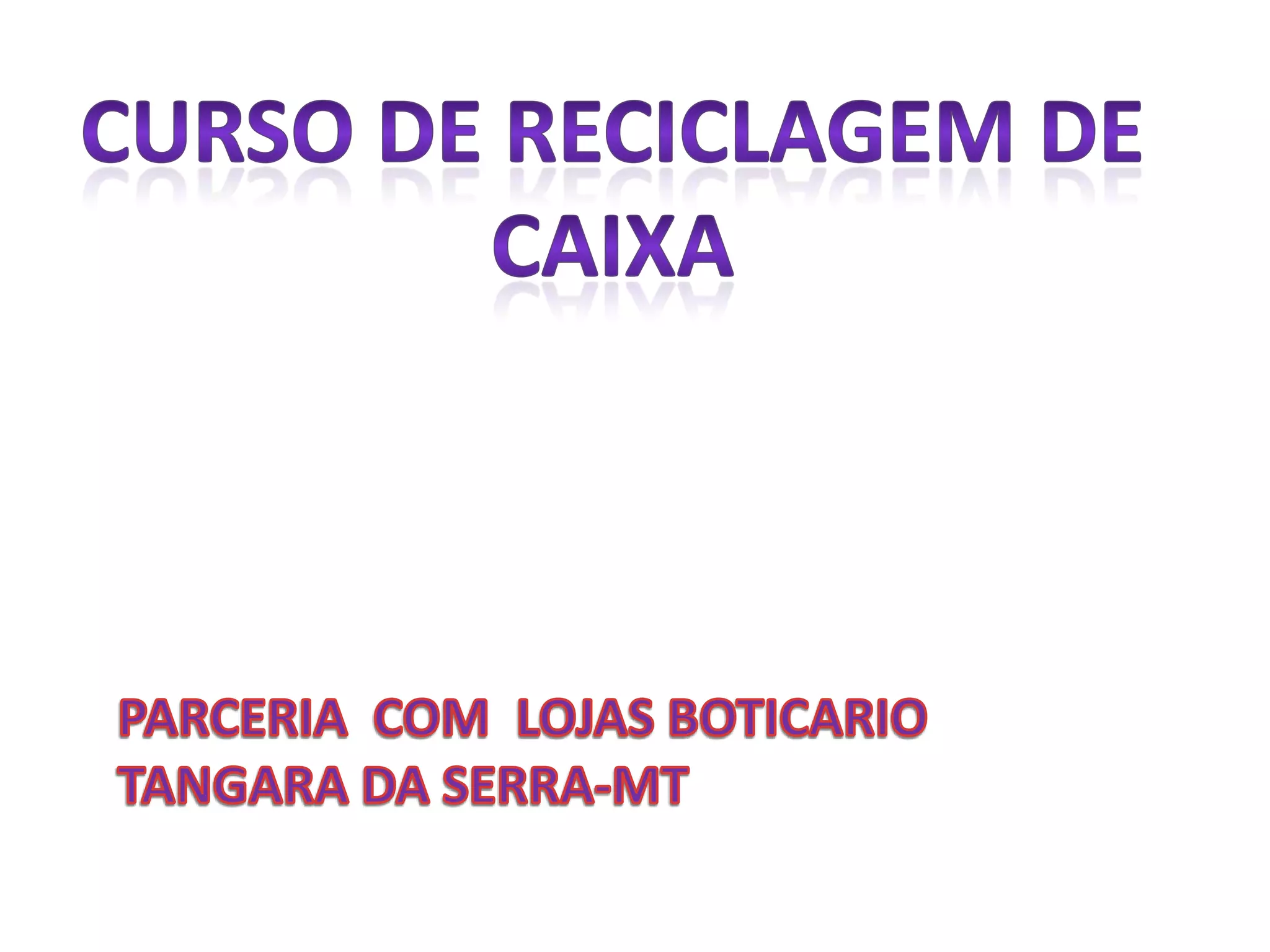 O curso de reciclagem de caixa em parceria com as Lojas Boticário em Tangará da Serra-MT ensinará técnicas para reciclar caixas de papelão usadas pelas lojas. O curso capacitará pessoas para transformarem o lixo em novos produtos e gerar renda extra. A parceria entre a prefeitura e o Boticário promoverá a sustentabilidade na cidade.