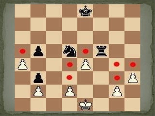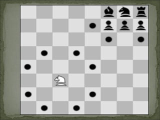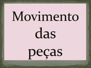 O documento descreve a origem e as regras do xadrez. O jogo foi criado na Índia no século VI para entreter um rei deprimido e simula um confronto entre exércitos com peças que se movem de maneiras diferentes. As peças incluem peões, cavalos, torres e bispos, cada um com seu próprio movimento único. O objetivo é dar xeque-mate no rei adversário ou colocá-lo em posição de afogamento.