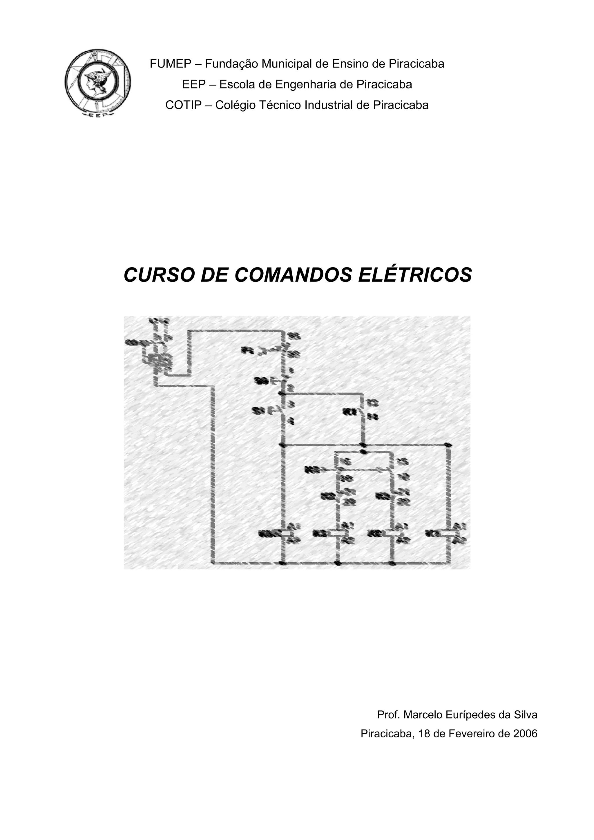 O documento descreve um curso sobre comandos elétricos, definindo os principais elementos como motores elétricos, contatos, relés e contatores. Explica como esses elementos podem ser associados para controlar cargas elétricas de forma segura.