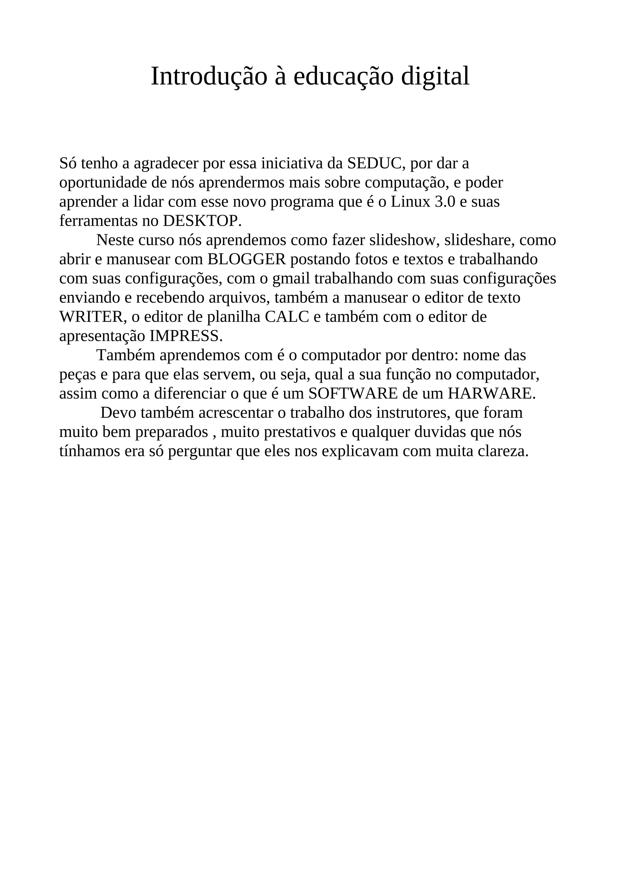 O documento resume um curso de introdução à educação digital, que ensinou estudantes sobre ferramentas do Linux, como o Blogger e Gmail, e editores do LibreOffice como Writer, Calc e Impress. O curso também explicou os componentes internos do computador e a diferença entre software e hardware. Os instrutores foram elogiados por serem bem preparados e prestativos em responder dúvidas dos alunos.