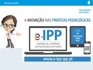 Este documento descreve um plano de formação em e/b-learning no IPP, com 5 módulos sobre conceitos, ferramentas de produção e publicação de conteúdos, comunicação web e construção de cursos online. Fornece detalhes sobre os objetivos de cada módulo, datas, recursos e equipa de apoio aos formandos.