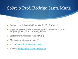 O documento é um curso sobre desenvolvimento web que abrange HTML, CSS e JavaScript, ministrado pelo Prof. Rodrigo Santa Maria. Ele apresenta conceitos sobre CSS, como sua sintaxe, propriedades e aplicabilidades, enfatizando a importância de usar folhas de estilo para organização e eficiência no desenvolvimento web. O curso também inclui testes para avaliar o entendimento dos alunos sobre as principais normas e usos do CSS.