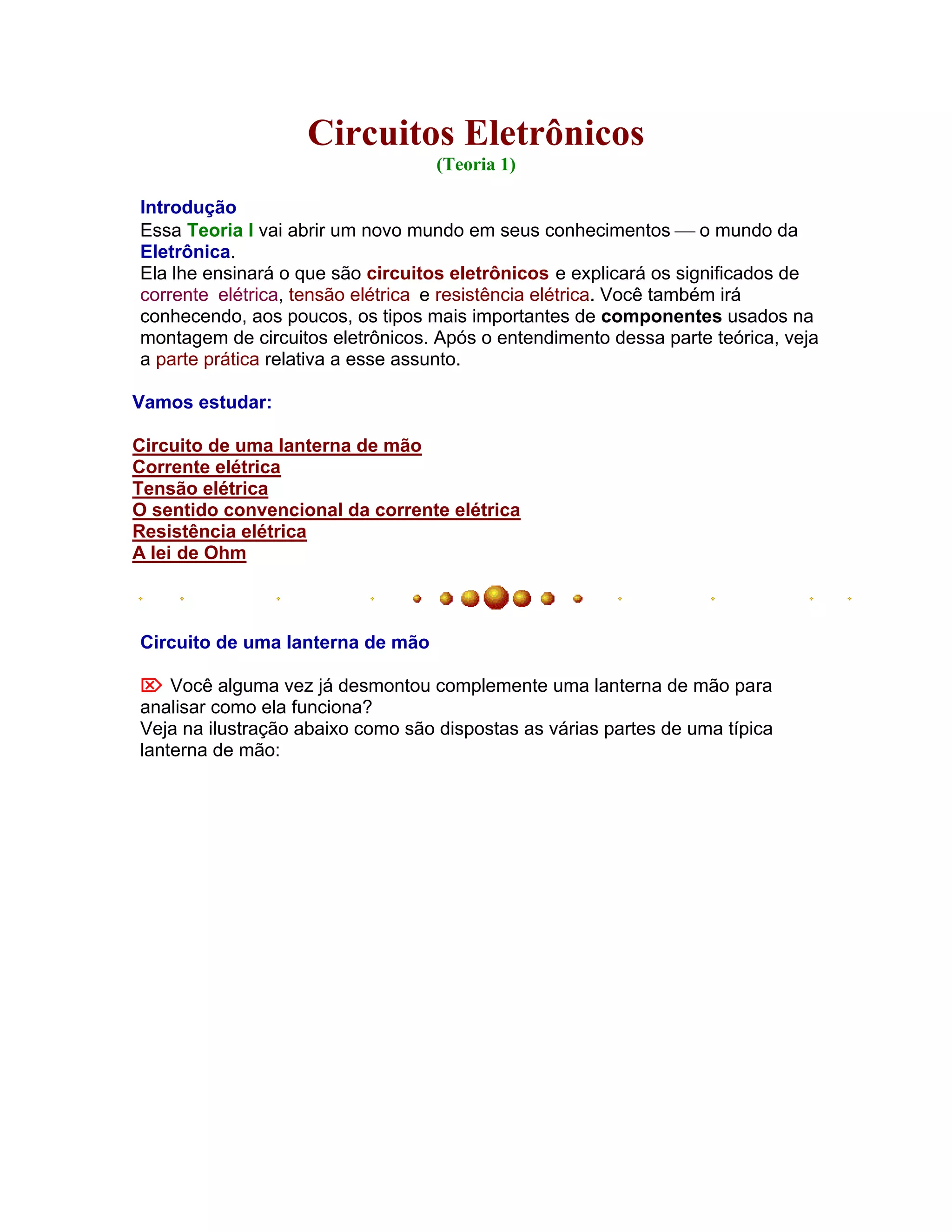 O documento aborda a teoria de circuitos eletrônicos, explicando conceitos fundamentais como corrente elétrica, tensão elétrica e resistência elétrica, além de introduzir componentes principais usados em circuitos. Exemplos práticos, como a montagem de uma lanterna, ilustram como esses conceitos se aplicam na vida real, incluindo o funcionamento de pilhas e lâmpadas. O texto também discute a diferença entre corrente contínua e alternada, além de apresentar a resistência elétrica e sua importância no controle do fluxo de corrente em circuitos.
