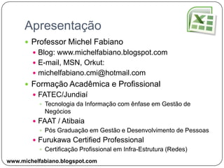 O documento apresenta um curso sobre Excel 2007 ministrado pelo professor Michel Fabiano. Contém informações sobre a formação acadêmica e profissional do professor, além de resumir os tópicos que serão abordados nas aulas como formatação de células, uso de funções e exercícios práticos.