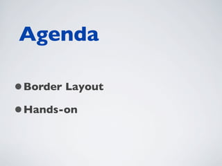 O documento apresenta uma agenda para um curso sobre o framework JavaScript Ext JS 4. O curso irá cobrir o layout Border e terá uma sessão prática. Requisitos incluem o SDK do Ext JS 4 e um navegador. Diferentes tipos de layout como Absolute, Accordion, Anchor, Border, Card, Column, Fit, HBox, Table e VBox serão explicados.