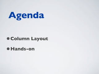 O documento apresenta uma agenda para um curso sobre o framework JavaScript Ext JS 4. O curso irá cobrir o layout de colunas e terá uma sessão prática. Requisitos para o curso incluem o SDK do Ext JS 4 e um navegador.