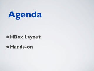 Este documento fornece uma agenda para um curso sobre o layout HBox no Ext JS 4. A agenda inclui uma introdução ao layout HBox e uma sessão prática com código. Requisitos para o curso incluem o SDK do Ext JS 4 e um navegador com suporte a JavaScript.