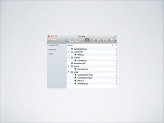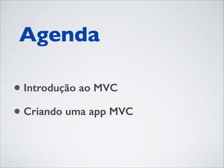O documento apresenta um tutorial sobre como criar uma aplicação MVC (Model-View-Controller) em Ext JS 4. Ele explica os conceitos básicos de MVC, como definir Model, View e Controller e mostra um exemplo completo de uma aplicação CRUD (Create, Read, Update, Delete) para gestão de contatos.