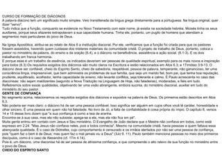 O documento descreve as qualidades essenciais para o ministério diaconal segundo a Bíblia, incluindo ser uma pessoa de confiança, cheia do Espírito Santo e com sabedoria. Também destaca a importância da respeitabilidade, ter uma palavra firme, equilíbrio e ter uma consciência limpa. O objetivo é fornecer uma visão abrangente dessas características para auxiliar no ministério da igreja.