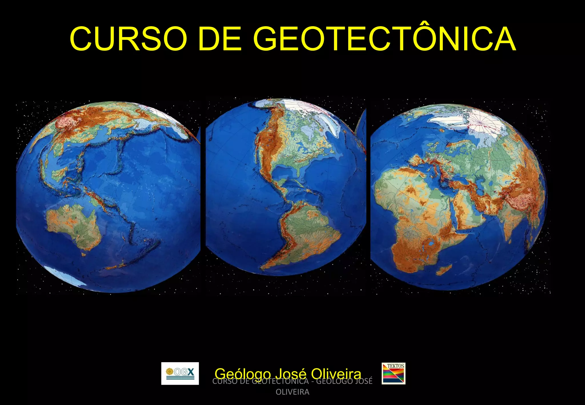 O documento apresenta um curso sobre geotectônica ministrado pelo geólogo José Oliveira, abordando tópicos como a história da deriva continental, estrutura interna da Terra, placas tectônicas, tipos de limites de placas (divergentes, transformantes e convergentes), subducção e colisão continental.