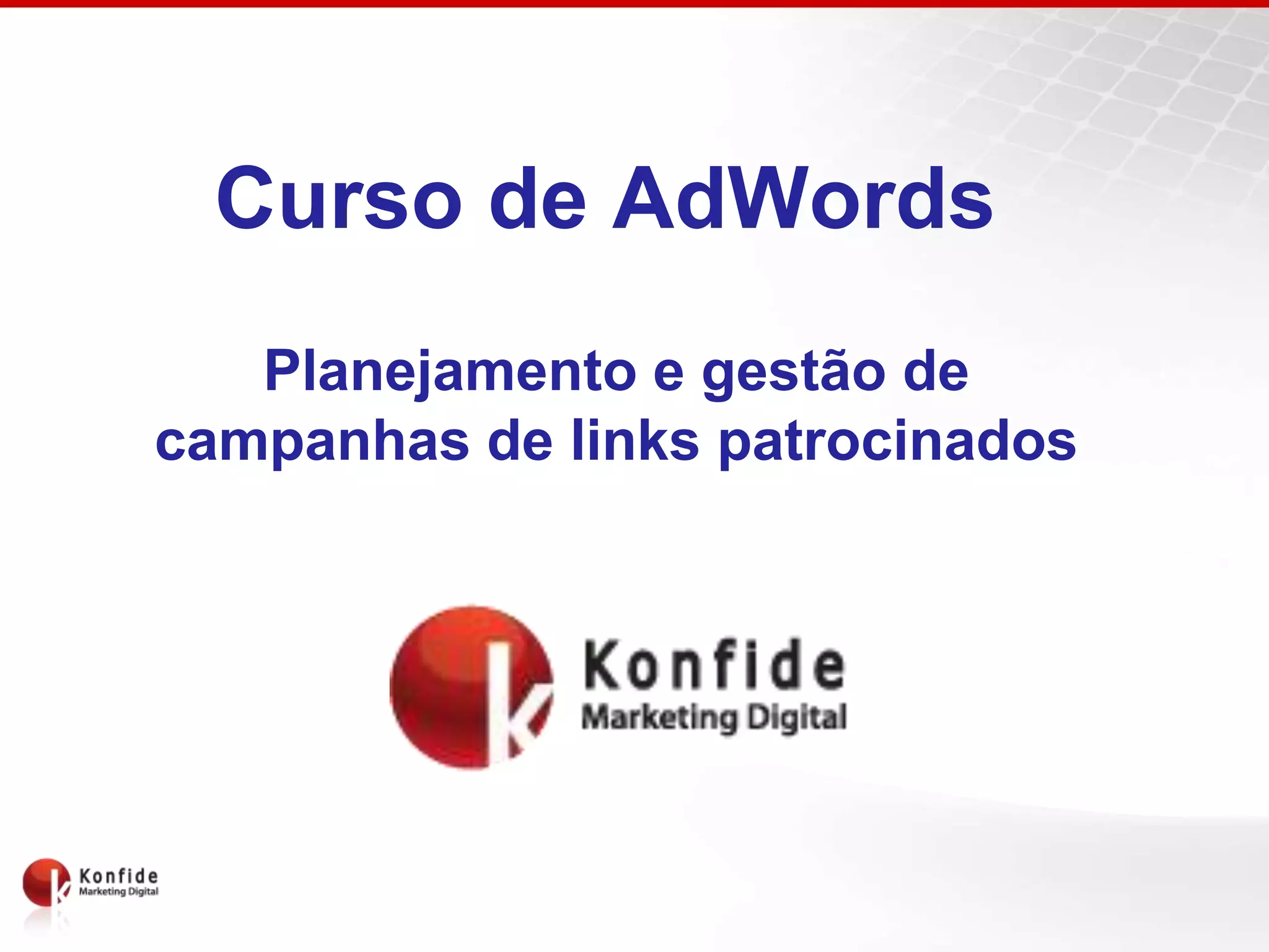 O documento apresenta um curso sobre planejamento e gestão de campanhas de links patrocinados no Google Ads, abordando desde a seleção de palavras-chave até a análise de resultados. Destaca a importância do marketing digital e as mudanças no comportamento dos consumidores na era da internet 2.0. Além disso, orienta sobre ferramentas e métricas para otimizar campanhas e melhorar a performance de anúncios.
