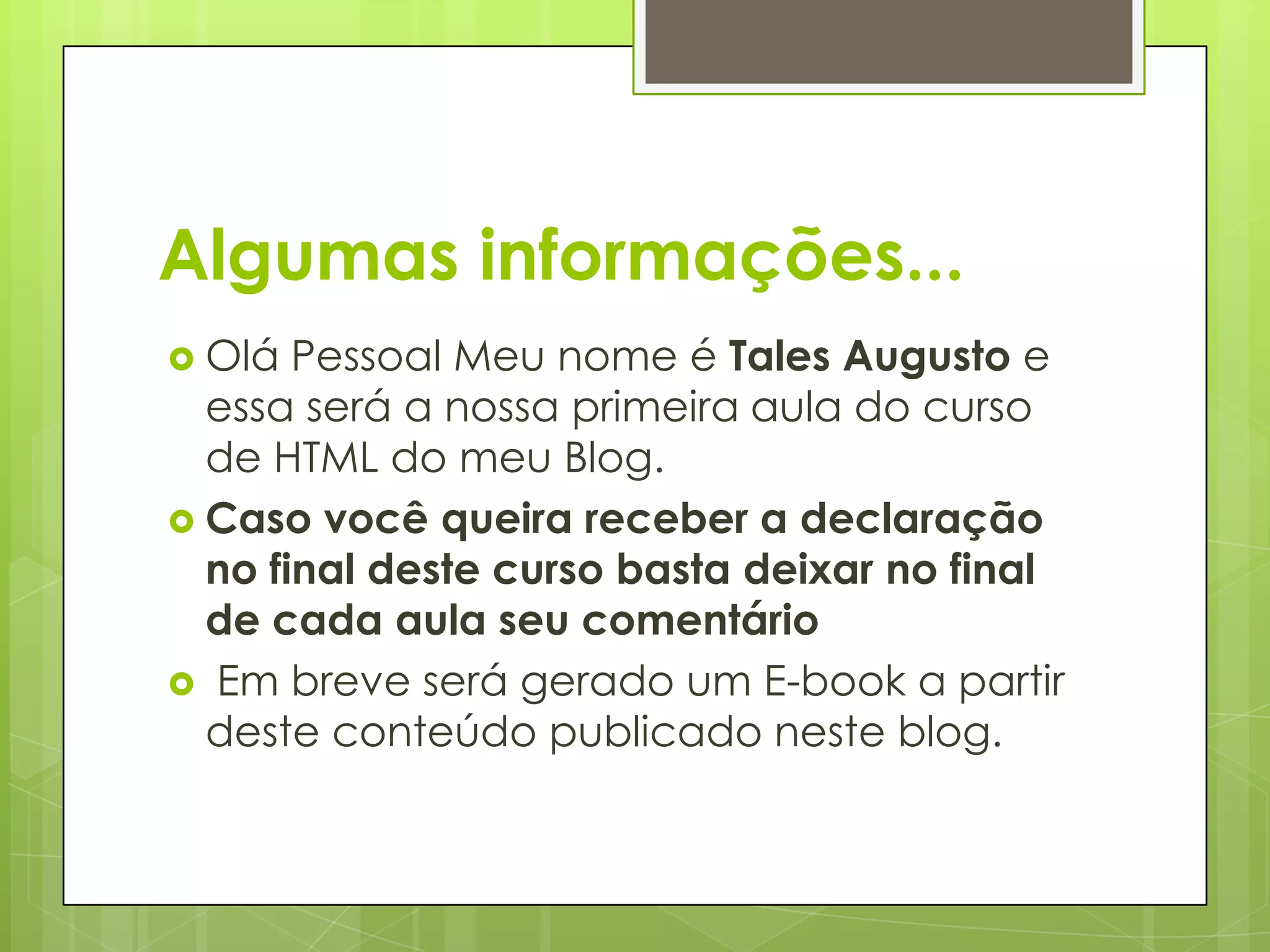 Este documento é uma introdução ao curso de HTML, escrita por Tales Augusto, destacando a origem, evolução e versões de HTML, incluindo HTML5. O autor menciona o criador do HTML, Tim Berners-Lee, e as mudanças nas especificações ao longo do tempo, bem como a necessidade de padrões para a web. O curso visa fornecer conhecimentos básicos e a estrutura para a criação de páginas na web utilizando HTML.