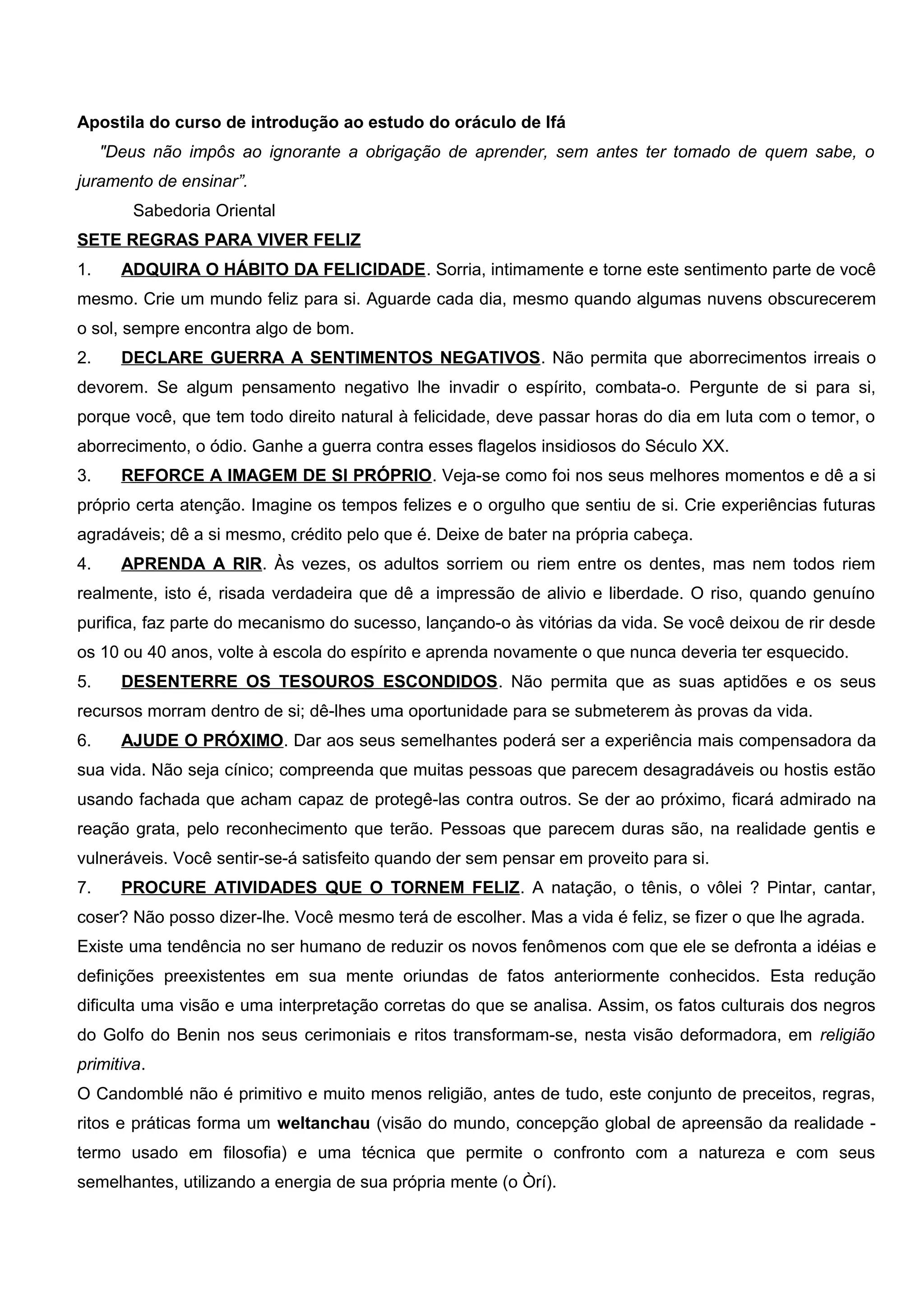 O documento apresenta uma introdução ao estudo do oráculo de Ifá, descrevendo suas sete regras para viver feliz, a importância do conhecimento do Odu pessoal para o equilíbrio na vida, e enfatizando que apenas a consulta ao Oráculo de Ifá pode determinar corretamente o Odu de uma pessoa.