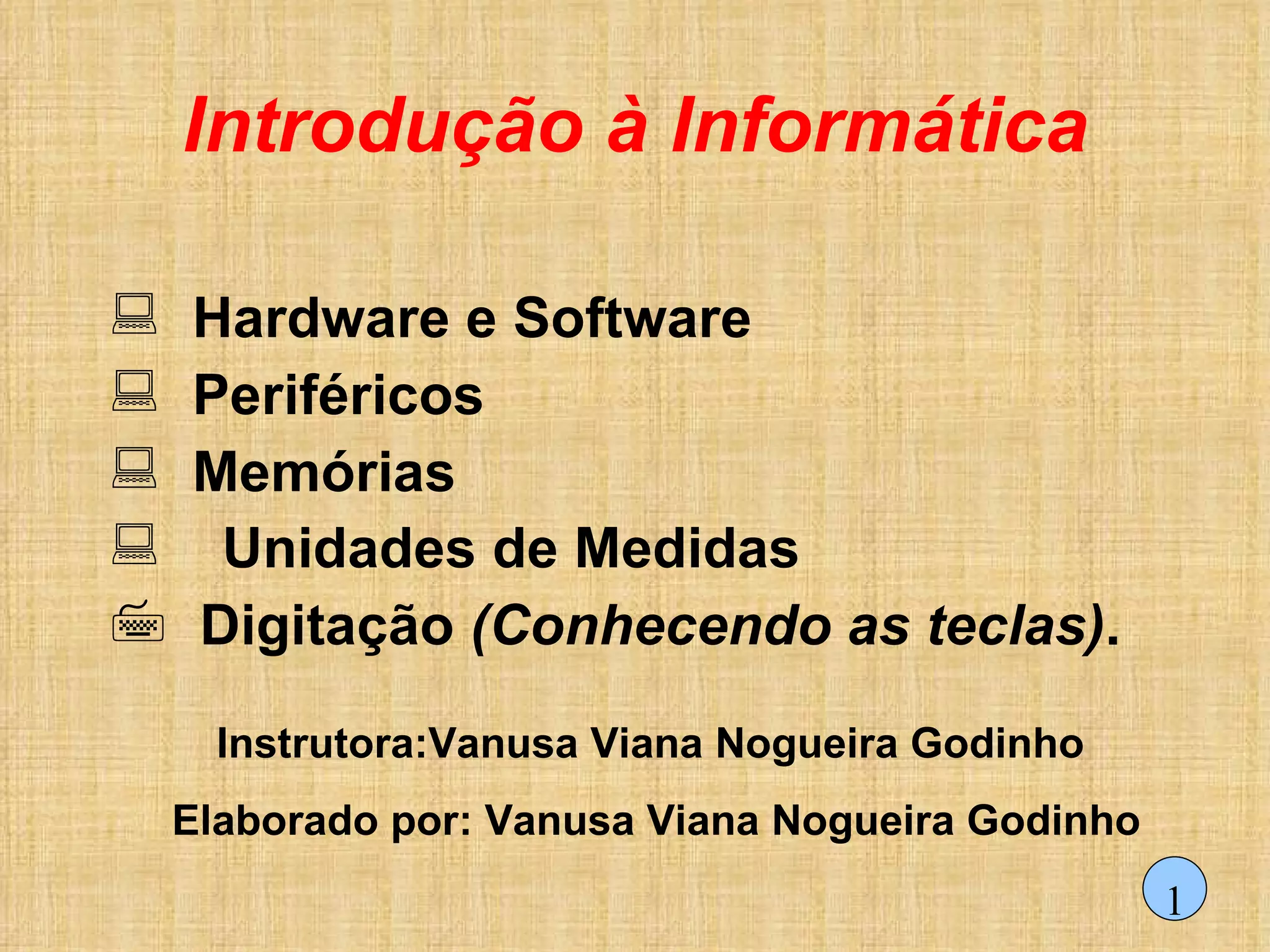O documento fornece uma introdução sobre hardware e software de computadores, definindo os principais componentes de hardware como a unidade central, placa-mãe e microprocessador. Também define e exemplifica os principais periféricos de entrada, saída e armazenamento. Por fim, explica brevemente conceitos como sistema operacional, software livre, vírus e unidades de medida digitais.