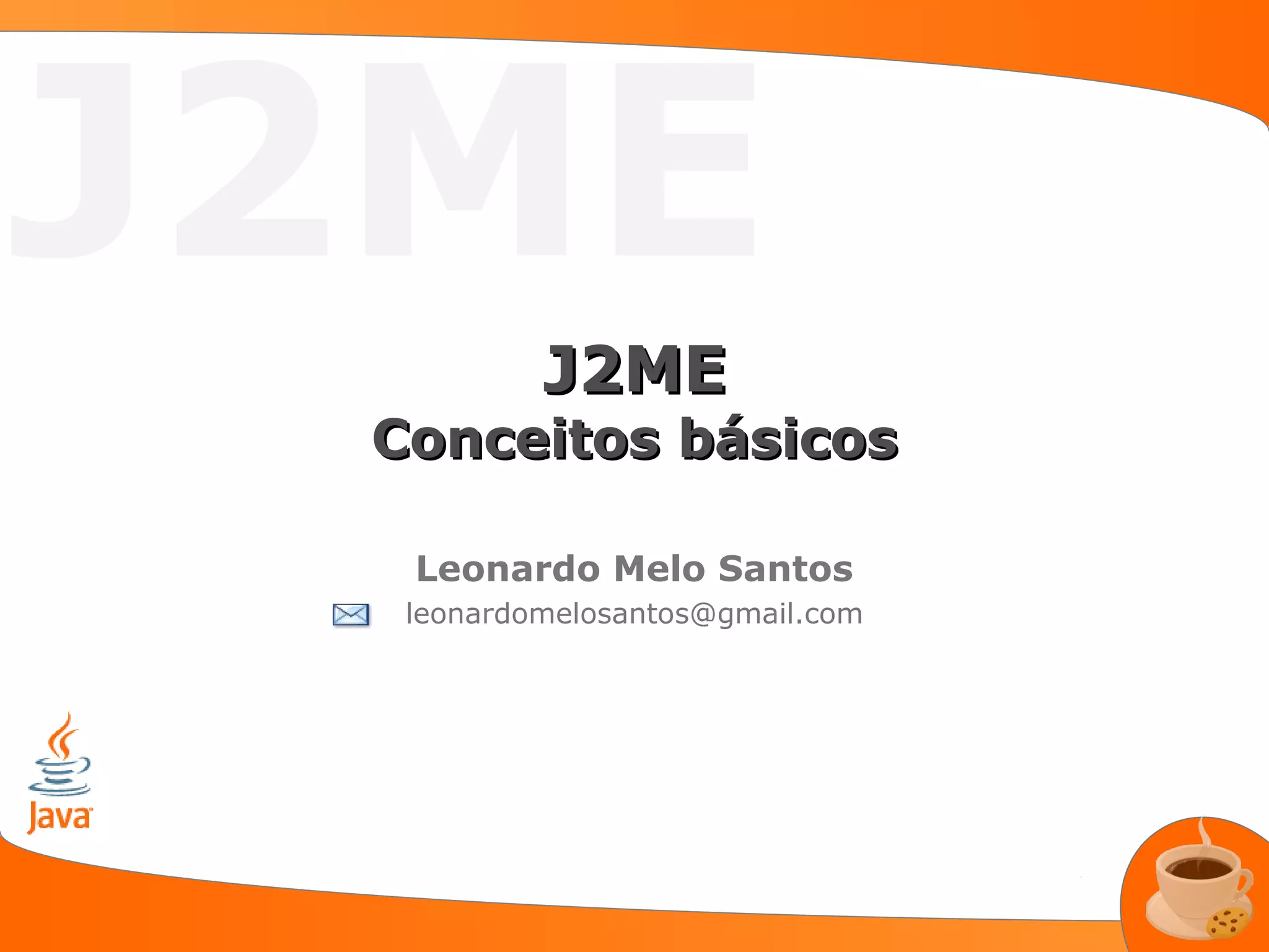 O documento discute conceitos básicos sobre J2ME, incluindo: (1) O que é J2ME e para que serve; (2) As configurações e perfis da plataforma Java para dispositivos móveis; (3) Exemplos de capacidades habilitadas por J2ME como gráficos, armazenamento de dados e comunicação.
