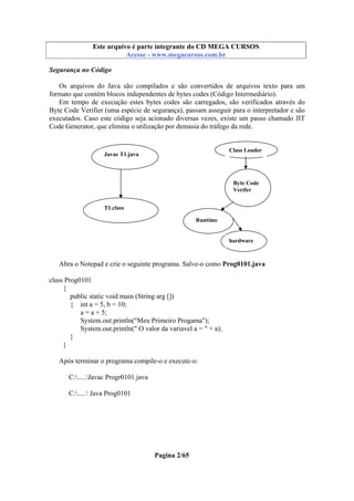 Este documento fornece um resumo sobre a linguagem de programação Java. Discute o que é Java, seus objetivos iniciais, tipos de dados, variáveis, operadores, controle de fluxo e arrays. O documento também apresenta exemplos de código para ilustrar esses conceitos.