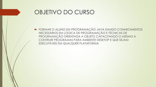 O curso objetiva formar alunos em programação Java, ensinando lógica de programação e técnicas de programação orientada a objetos para que possam construir programas para desktop executáveis em qualquer plataforma. Java é uma linguagem orientada a objetos desenvolvida pela Sun Microsystems na década de 1990 que permite portabilidade de código através da compilação para bytecode. Um programa Java é compilado para bytecode que é executado por uma máquina virtual Java em diferentes sistemas.