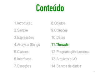 1. O documento apresenta os fundamentos de programação concorrente em Java, incluindo threads, a interface Runnable, como iniciar novos threads, interrupção de threads, espera de threads e problemas de corrida.