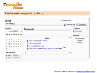 Este documento apresenta os principais recursos disponíveis no Moodle para estruturar cursos online, incluindo livros, páginas, links para arquivos e URLs, pastas e rótulos. Explica como cada recurso pode ser configurado e utilizado de forma a ampliar a aprendizagem dos usuários de forma organizada e planejada.