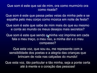 O documento discute diversos aspectos da oratória e da comunicação oral, incluindo elementos como aparência, postura, voz, gestos, dicção, ritmo, vocabulário, controle do medo, como falar em público, entrevistas e como projetar confiança. Fornece também dicas sobre pronúncia, sotaque, silêncio, emoção, nervosismo e prática de leitura em voz alta.