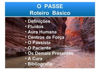 O documento descreve o que é o passe, como uma transfusão de energias que altera o campo celular de acordo com André Luiz e Emmanuel. Explica também o que é a mediunidade de cura, fluidos como o fluido vital e magnético, a aura humana e os centros de força. Detalha quem pode aplicar e receber o passe, quando não aplicá-lo e como deve ser a postura mental do passeador e paciente.