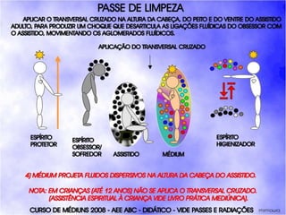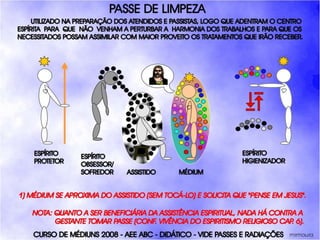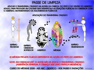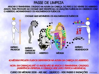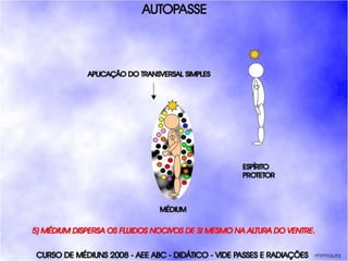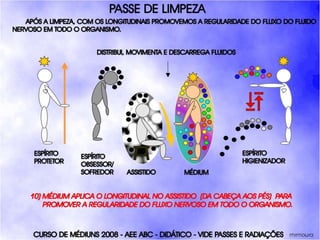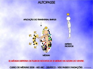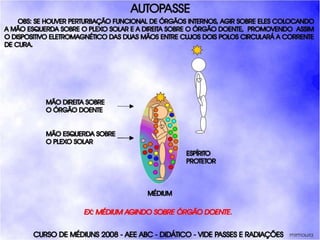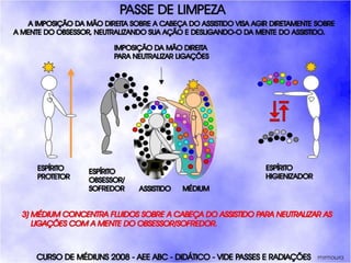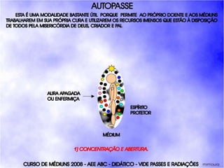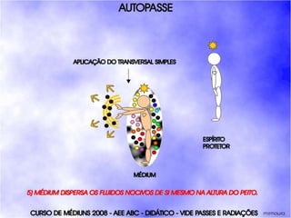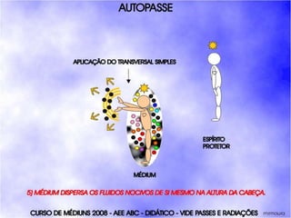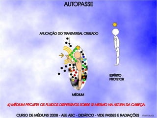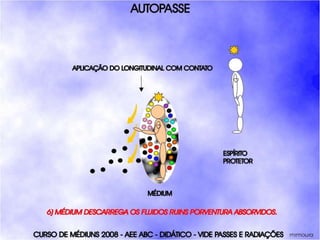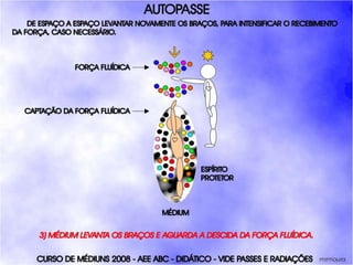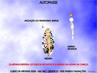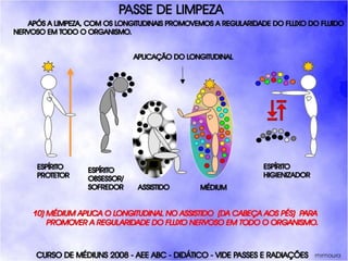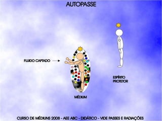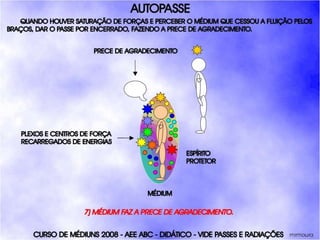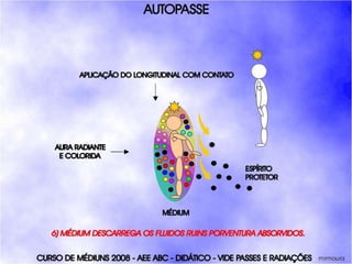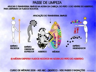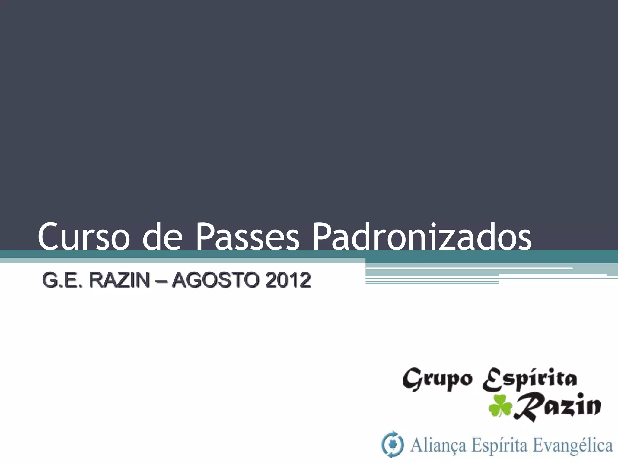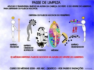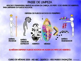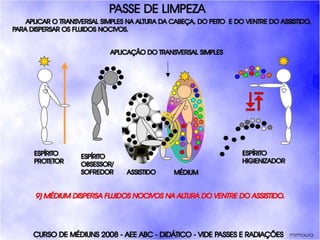 O documento descreve um curso de passes padronizados para médiuns, com o objetivo de educá-los no desenvolvimento e uso da mediunidade direcionada aos trabalhos evangélicos com base nos princípios da doutrina espírita. O curso inclui parte teórica sobre passes, mediunidade, psiquismo e cromoterapia, além de módulos práticos sobre diferentes técnicas de passes.