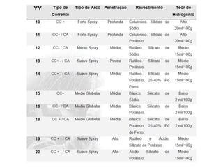 O documento descreve o processo de soldagem com eletrodo revestido, incluindo equipamentos, consumíveis, técnicas e defeitos comuns. É um processo manual que usa eletrodos revestidos para gerar um arco elétrico e soldar metais. Requer habilidade do soldador para controlar o arco e obter soldas de qualidade.