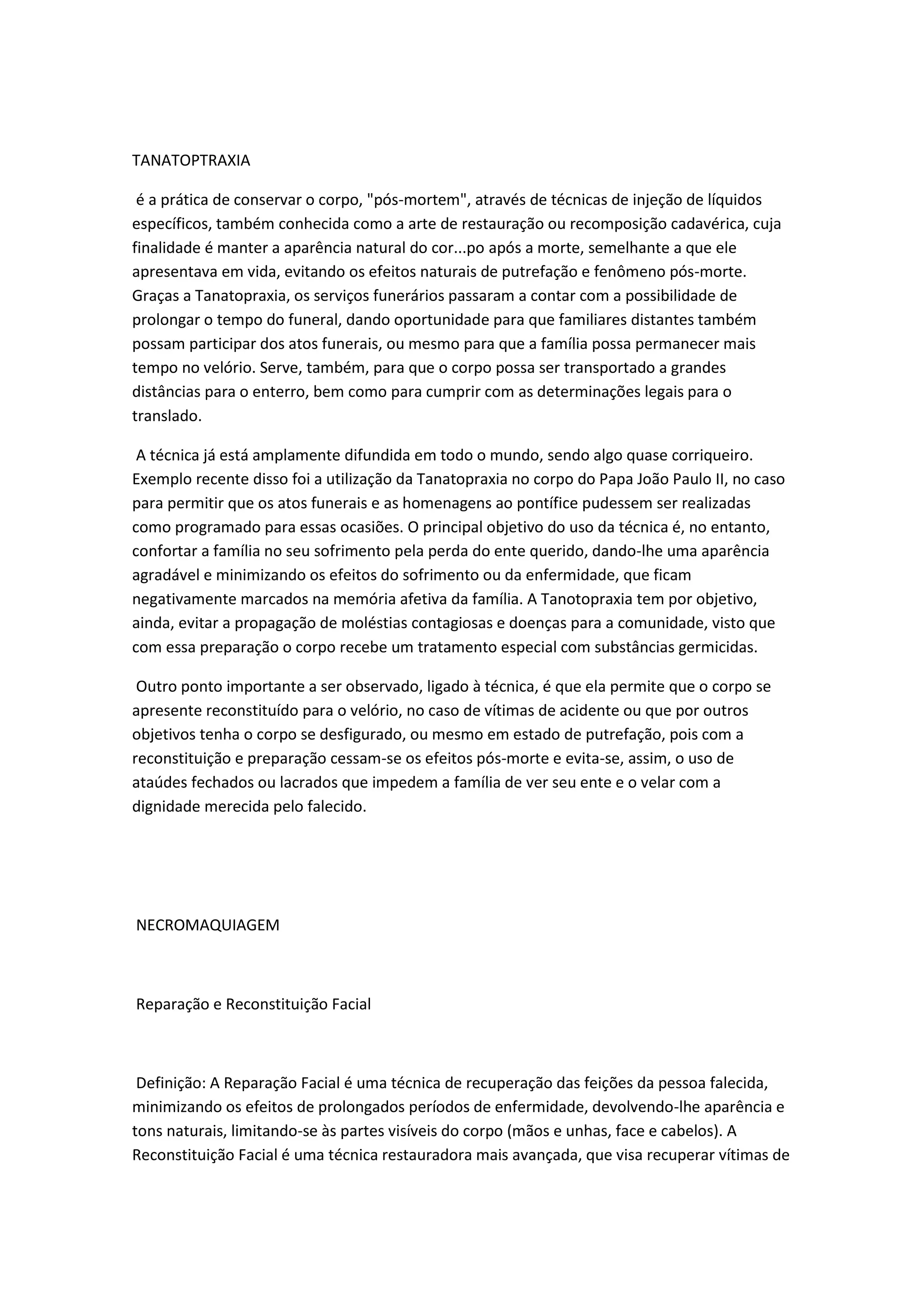 A tanatopraxia é a técnica de conservação de corpos após a morte através da injeção de líquidos especiais para manter a aparência natural e evitar a decomposição. Isso permite velórios mais longos e o transporte de corpos grandes distâncias. A técnica é amplamente usada e objetiva confortar os familiares e evitar a propagação de doenças.