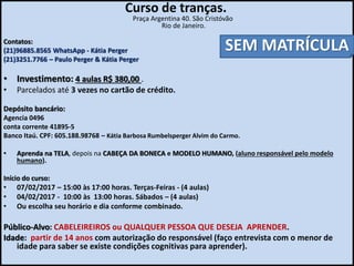 O curso de tranças, ministrado por Kátia e Paulo Perger no espaço Perger em São Cristóvão, Rio de Janeiro, oferece 4 aulas por R$ 380,00, com opções de parcelamento. As aulas começam em 07/02/2017 em diversos horários e são destinadas a cabeleireiros e qualquer pessoa acima de 14 anos, com autorização dos responsáveis. Não há taxa de matrícula e o aprendizado inclui prática em bonecas e modelos humanos.