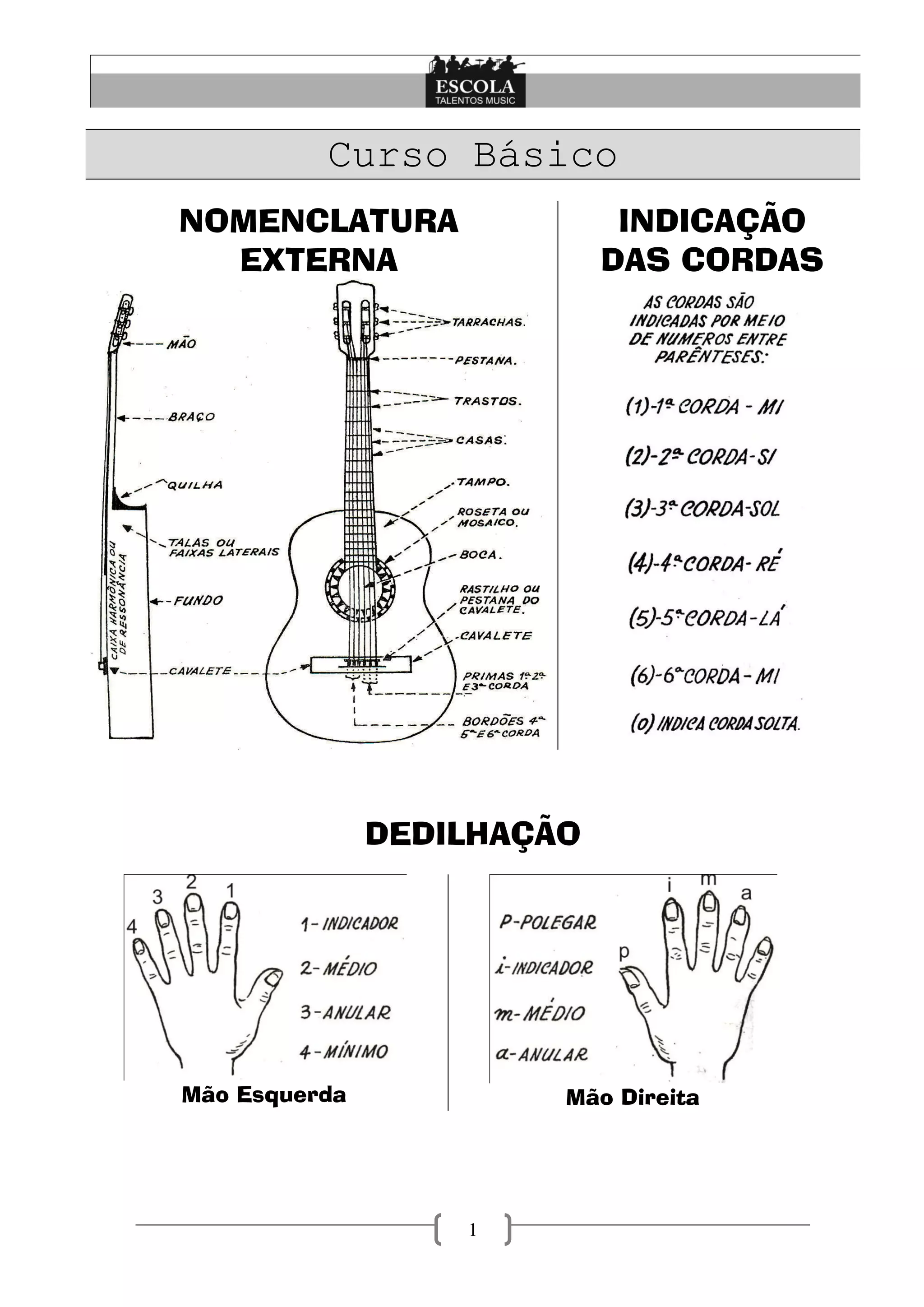 [1] O documento descreve as partes principais do violão e sua nomenclatura, incluindo cabeçote, trastes, braço, roseta, bocal, caixa de ressonância, tampo, mecânicas, ponte superior, casas, escala, ilhargas, quilha, tampo inferior e ponte inferior. [2] Também explica o processo de afinação do violão e fornece uma tabela de afinação. [3] Por fim, discute onde e como sentar corretamente para tocar violão.
