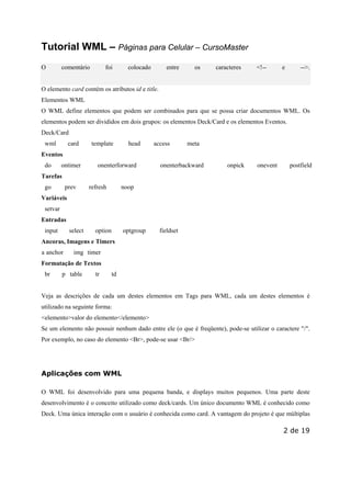 Este documento fornece uma introdução ao WML (Wireless Markup Language), incluindo: