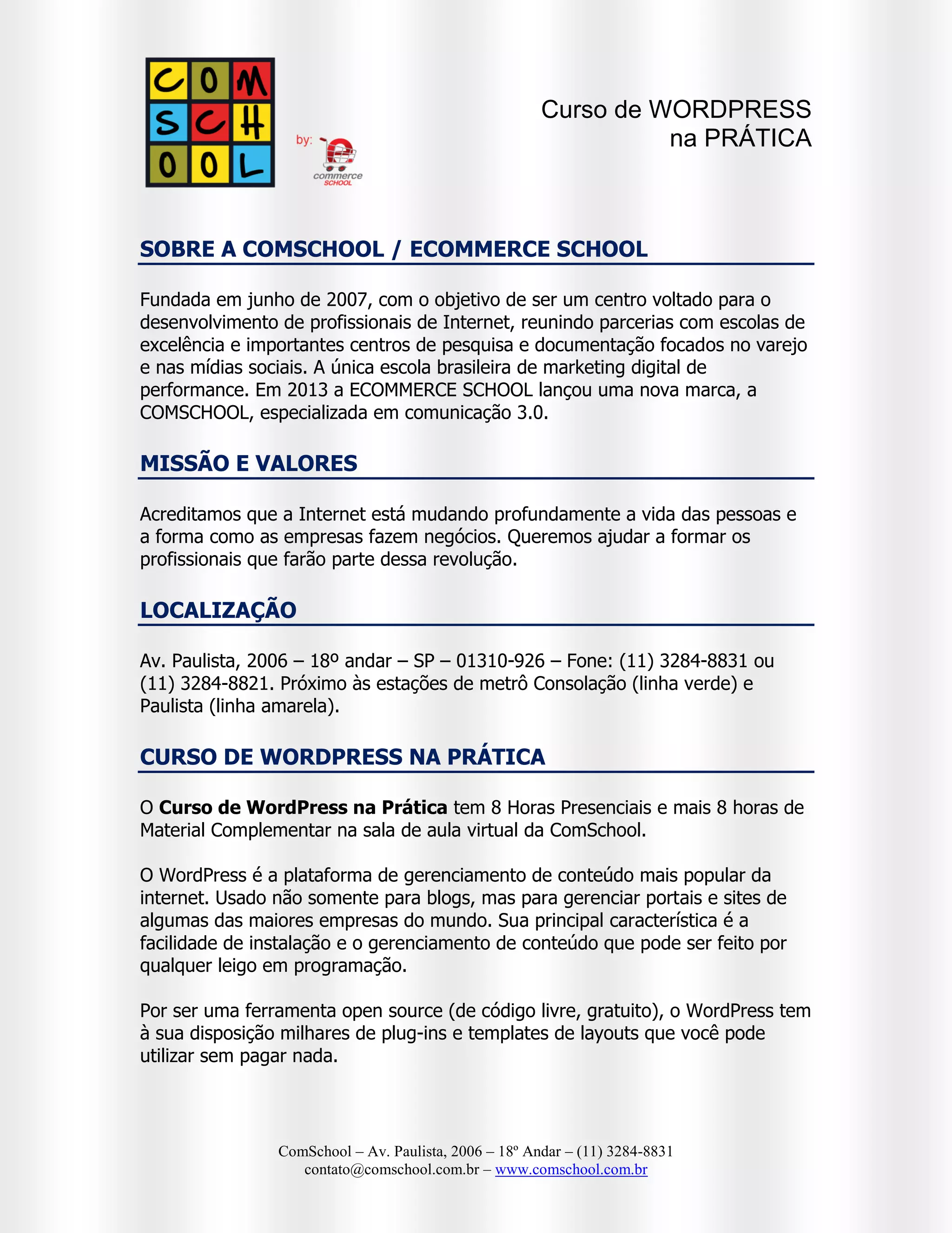 O documento descreve um curso de WordPress na prática oferecido pela ComSchool, com 8 horas presenciais e 8 horas online. O curso ensina desde a instalação do WordPress até a personalização e uso de plugins, com o objetivo de apresentar como ferramenta de comunicação e CMS, ensinar a instalar e configurar, criar sites e blogs ao vivo e demonstrar onde encontrar temas e plugins.