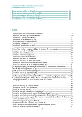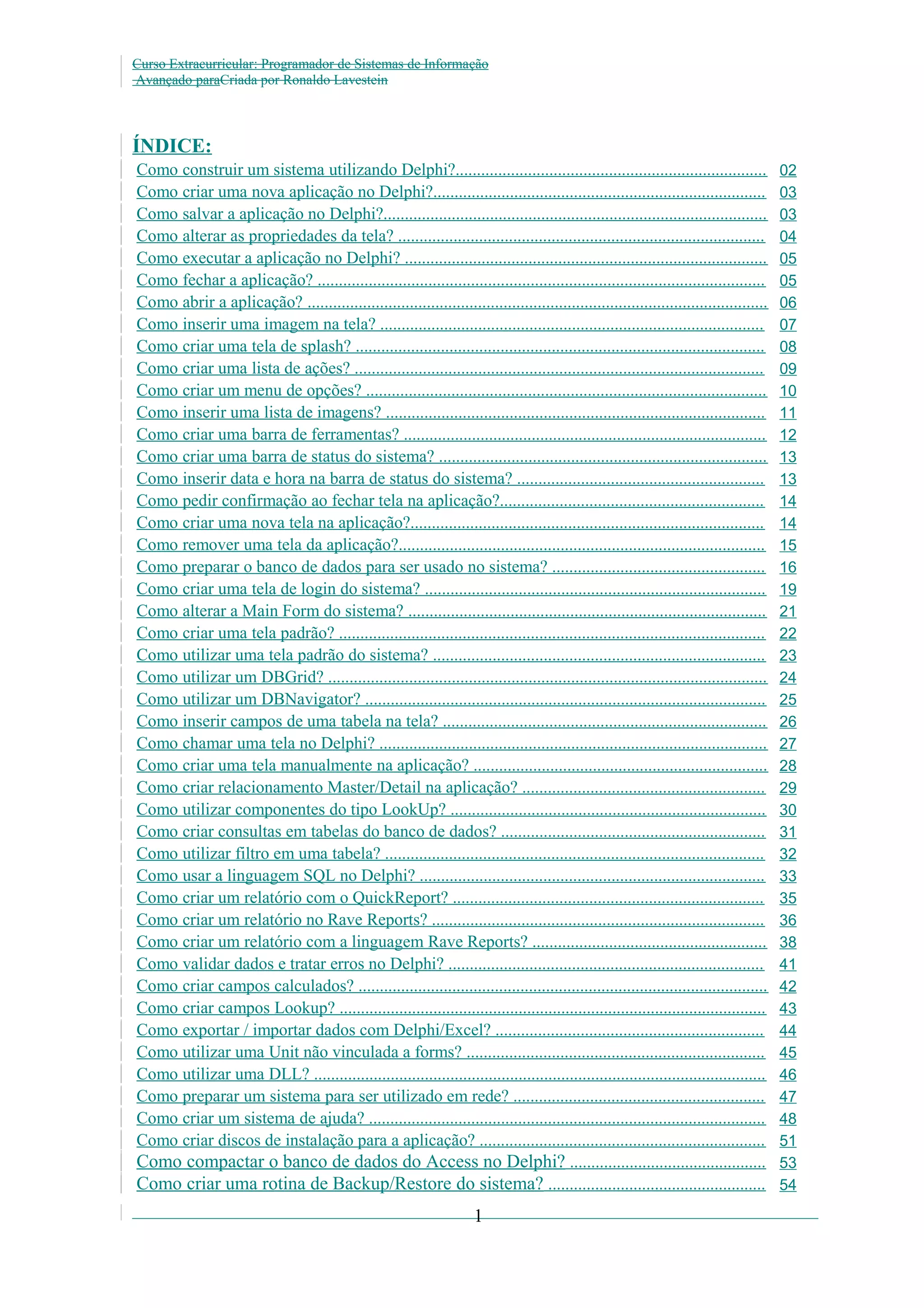 Este documento fornece instruções passo a passo sobre como construir um sistema de informação completo utilizando a linguagem de programação Delphi. Ele aborda tópicos como criação de telas, interfaces gráficas, bancos de dados, relatórios, instalação e outros recursos importantes. O índice lista 58 tópicos cobrindo todas as etapas do desenvolvimento de um sistema com Delphi.