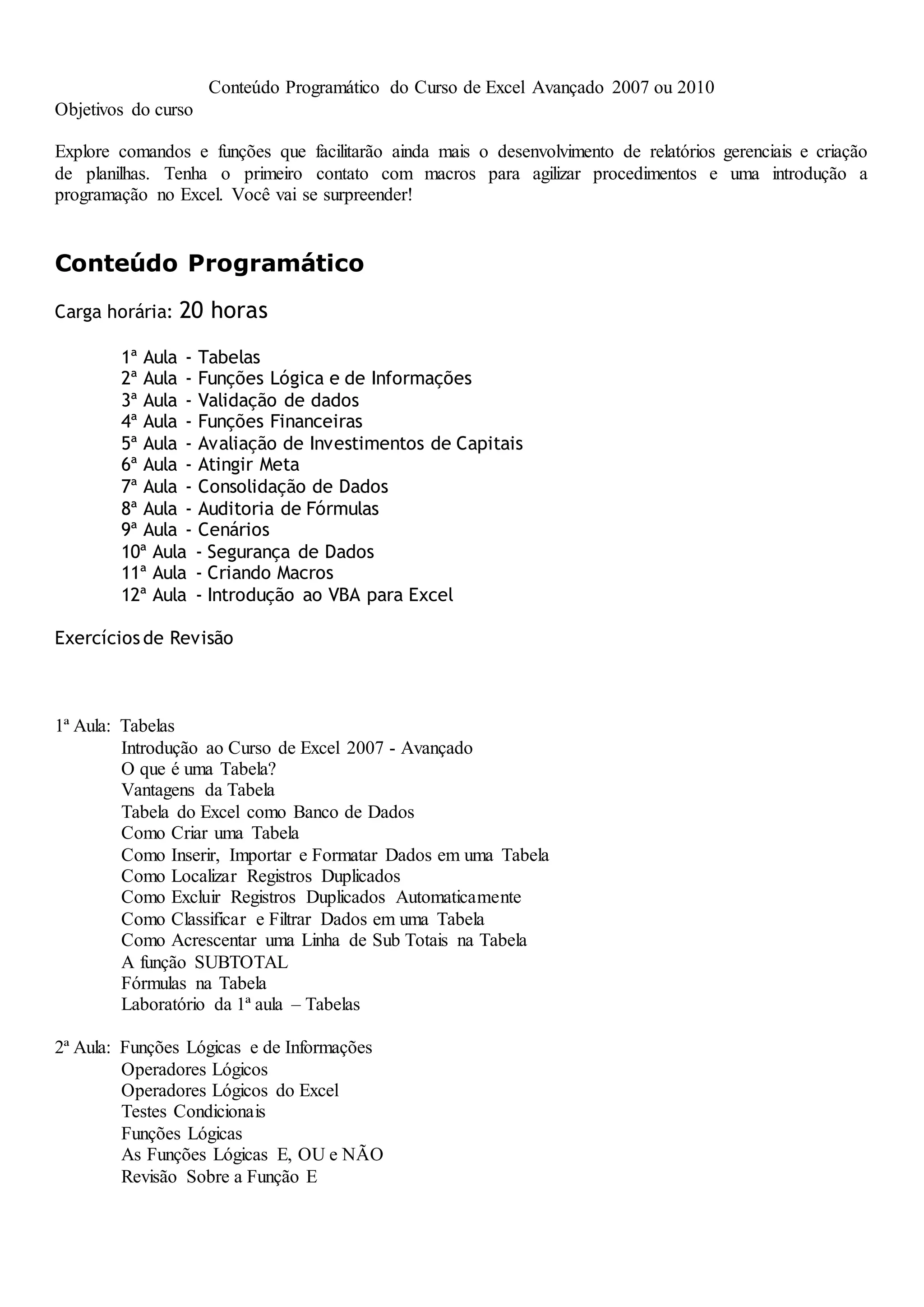 Conteúdo Programático doCurso de Excel Avançado 2007 ou 2010