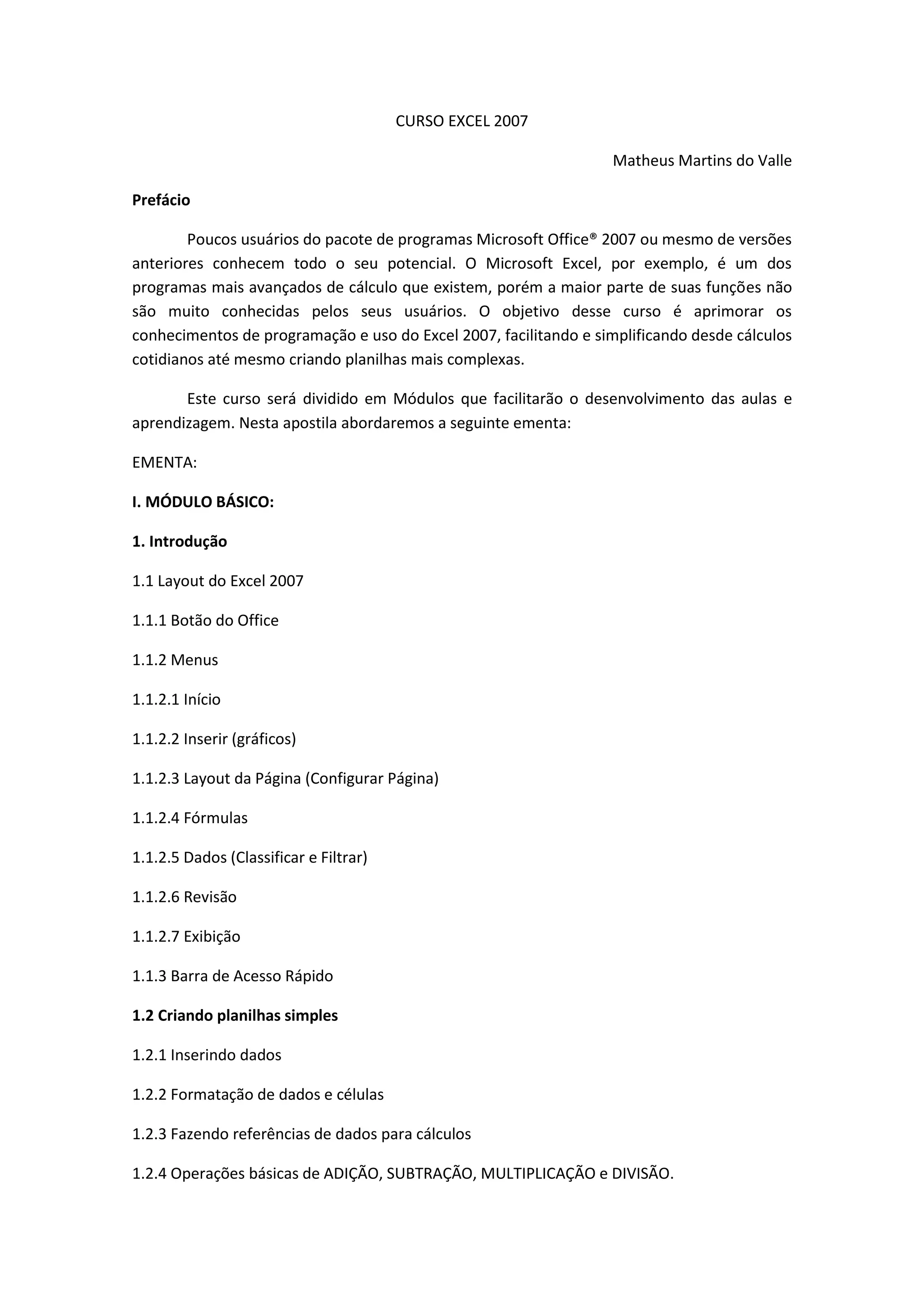 Este documento apresenta um curso básico sobre o Excel 2007, dividido em módulos. O Módulo I introduz o layout do Excel 2007, como criar planilhas simples, inserir dados e fórmulas, criar gráficos e exercícios de fixação.