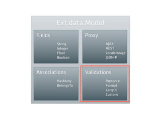 Este documento apresenta um curso sobre validações de modelo no Ext JS 4, ministrado por Loiane Groner. Inclui tópicos como declaração de validações, tratamento de erros e um exemplo prático, além de fornecer links para o código e contato. Requisitos incluem o SDK do Ext JS 4, um servidor Apache, um editor de texto e um navegador.