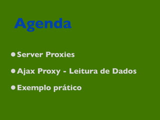 O documento apresenta uma agenda para um curso sobre Ext JS 4, cobrindo tópicos como servidores proxies, ajax proxy para leitura de dados e um exemplo prático. Ele também fornece links relevantes como o código fonte da aula e o link para o curso completo.
