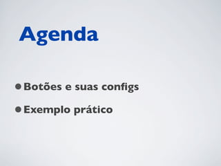 O documento apresenta uma agenda para um curso sobre botões no Ext JS 4. A agenda inclui tópicos como configurações de botões e um exemplo prático. Informações sobre requisitos técnicos e links para código fonte e vídeos do curso também são fornecidos.