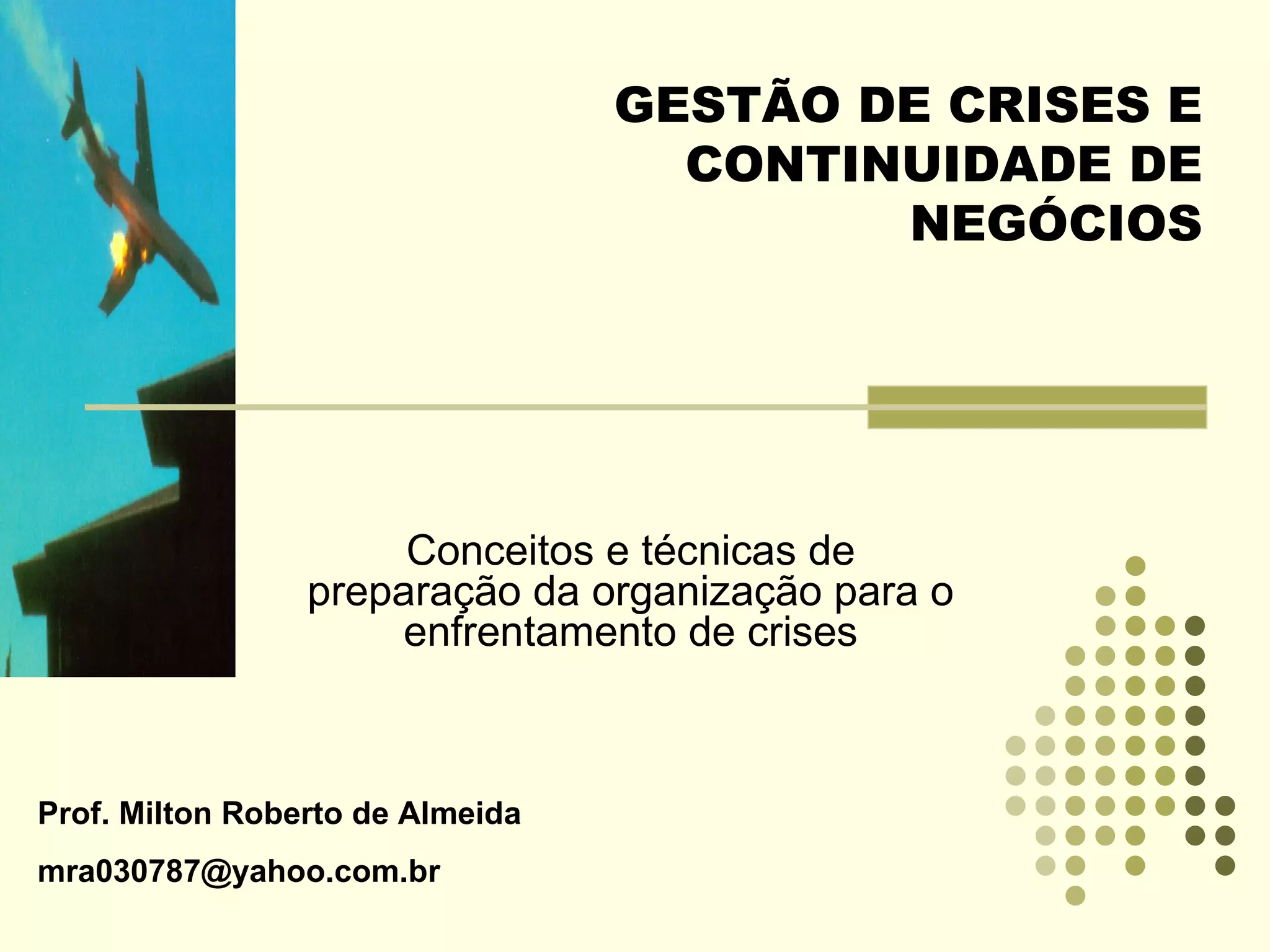1) O documento discute conceitos e técnicas de preparação organizacional para enfrentar crises, incluindo identificação de ameaças internas e externas, desenvolvimento de planos de continuidade de negócios e estratégias de prevenção, reação e recuperação.