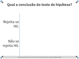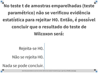 Este documento discute procedimentos estatísticos para testes de hipóteses, incluindo: 1) escolha entre testes paramétricos e não paramétricos dependendo do tamanho e distribuição das amostras; 2) formulação de hipóteses nulas e alternativas; 3) cálculo e interpretação de estatísticas de teste como o teste t. Exemplos ilustram como aplicar esses procedimentos para testar diferenças entre médias em diferentes tipos de amostras.