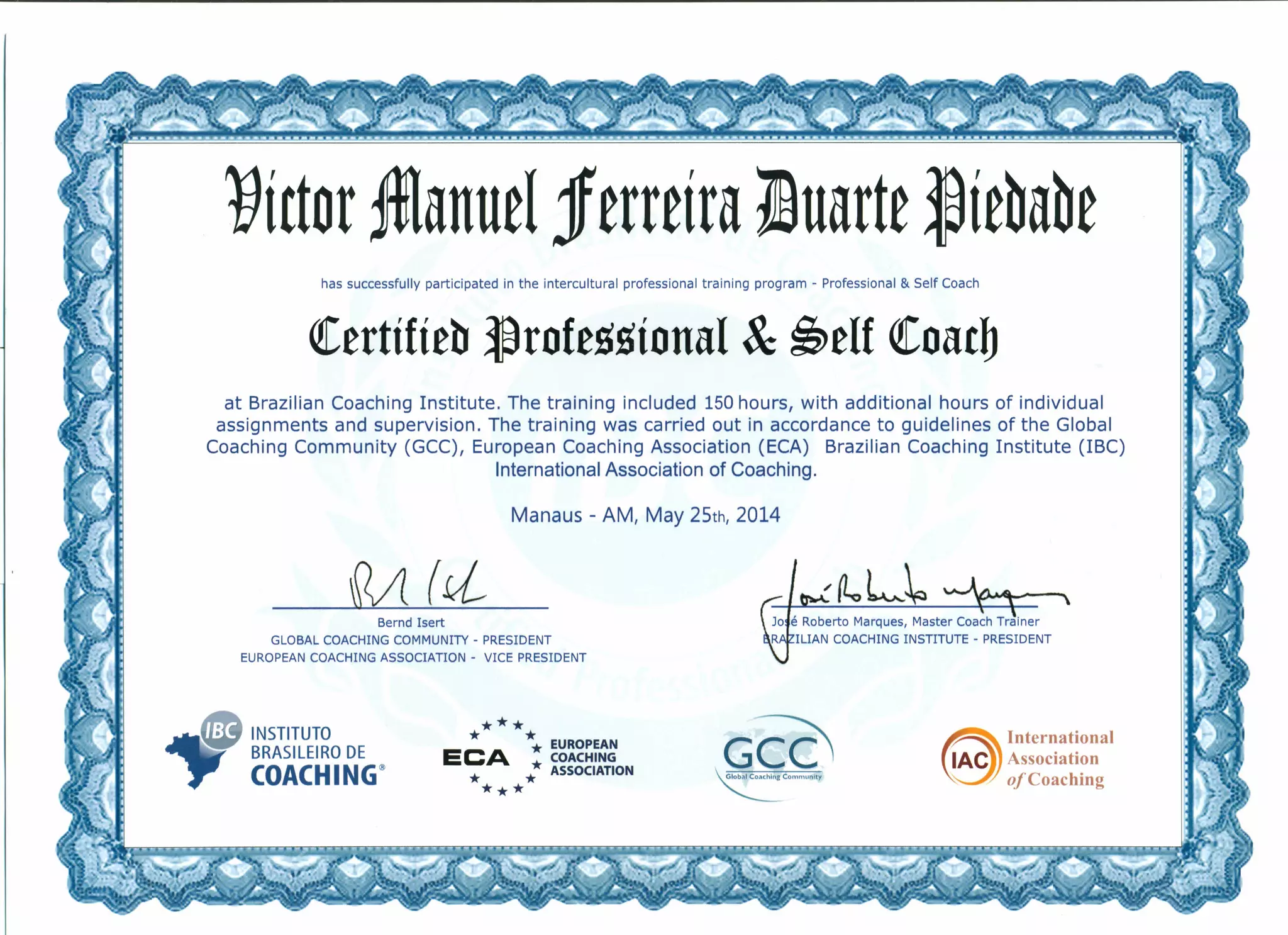 Victor Manuel Ferreira Duarte Piedade completou com sucesso um programa de treinamento profissional e pessoal em coaching oferecido pelo Instituto Brasileiro de Coaching. O treinamento incluiu 150 horas de aulas e atividades individuais de acordo com as diretrizes de várias associações de coaching globais e brasileiras. Ele recebeu certificados comprovando sua qualificação em várias áreas relacionadas a coaching.