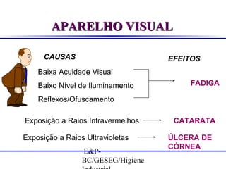 [2] São descritos os aparelhos visuais humanos e como a baixa iluminação pode causar fadiga, catarata e úlcera de córnea.