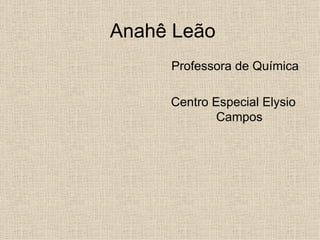 O documento fornece informações sobre uma professora de química chamada Anahê Leão que trabalha no Centro Especial Elysio Campos localizado na Rua 801 chácara 06 vila Oswaldo Rosa. Ele também inclui um link para um site sobre a importância da química em nossa vida.