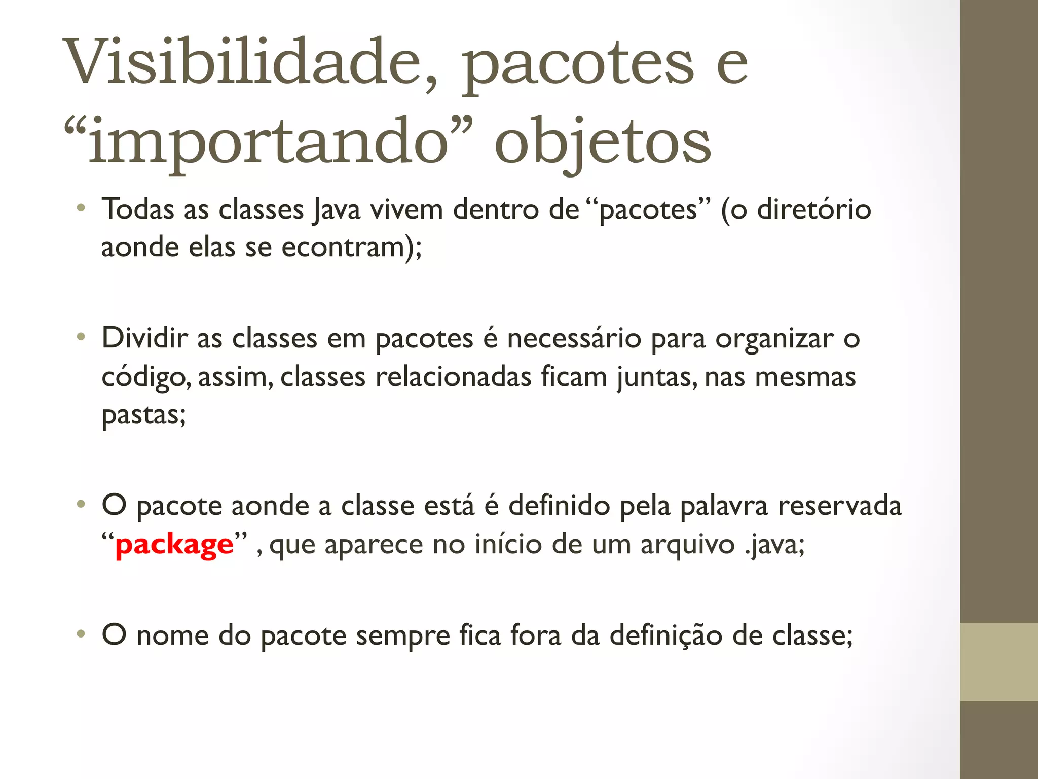 O documento discute conceitos fundamentais de orientação a objetos em Java, como:
