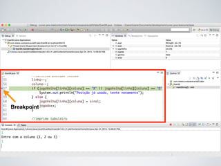 O documento fornece instruções sobre como usar o depurador no Eclipse para debugar código Java, explicando conceitos como breakpoints, variáveis de escopo, pilha e botões de controle para depuração. Ele também fornece links para cursos e tutoriais online sobre Java básico, Git e GitHub.