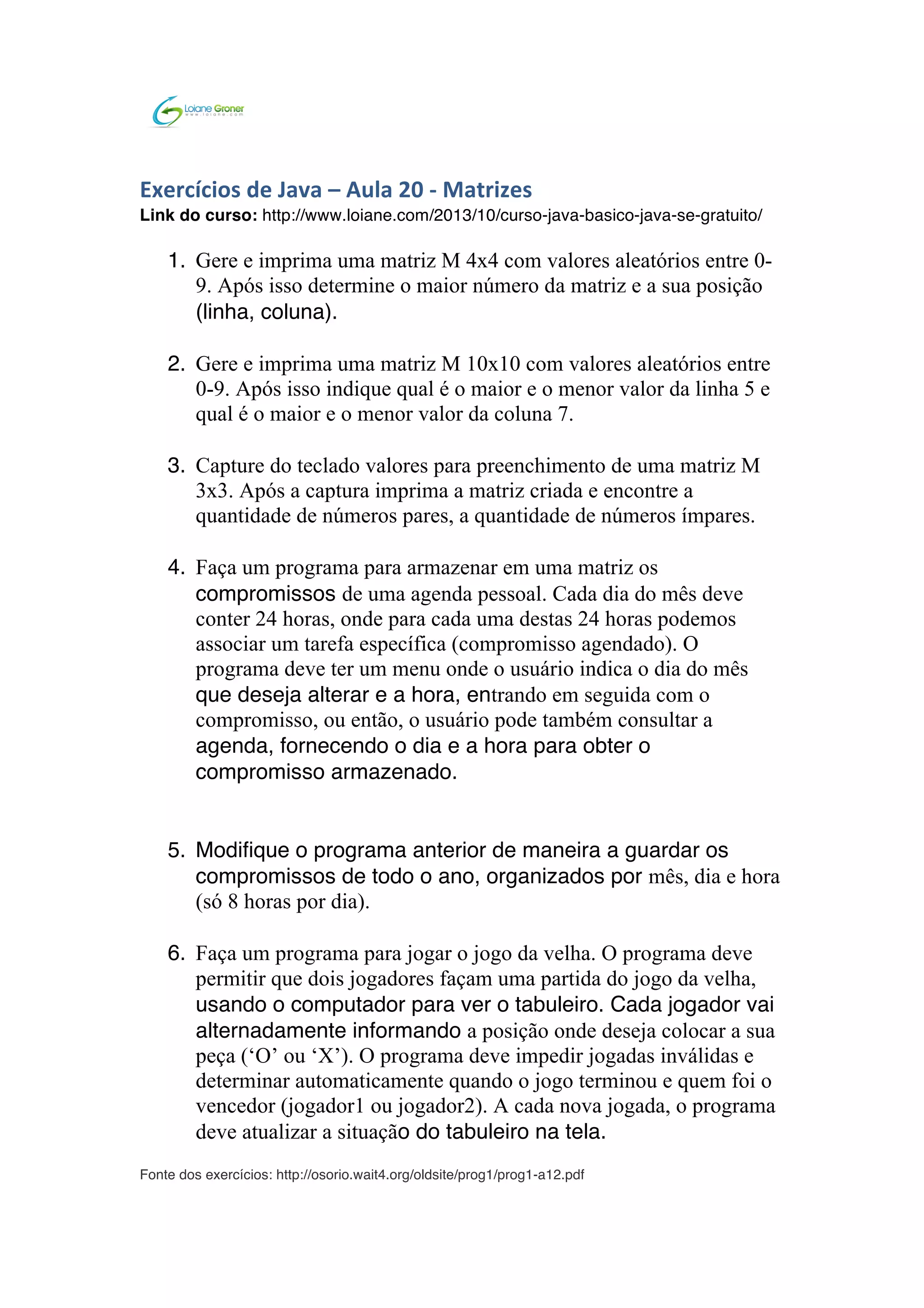 O documento apresenta 6 exercícios sobre matrizes e jogo da velha em Java. O primeiro exercício pede para gerar uma matriz 4x4 com números aleatórios e encontrar o maior número e sua posição. O segundo exercício pede para gerar uma matriz 10x10 com números aleatórios e encontrar os maiores e menores valores das linhas e colunas específicas. O terceiro exercício pede para preencher uma matriz 3x3 com valores do teclado e contar pares e ímpares.